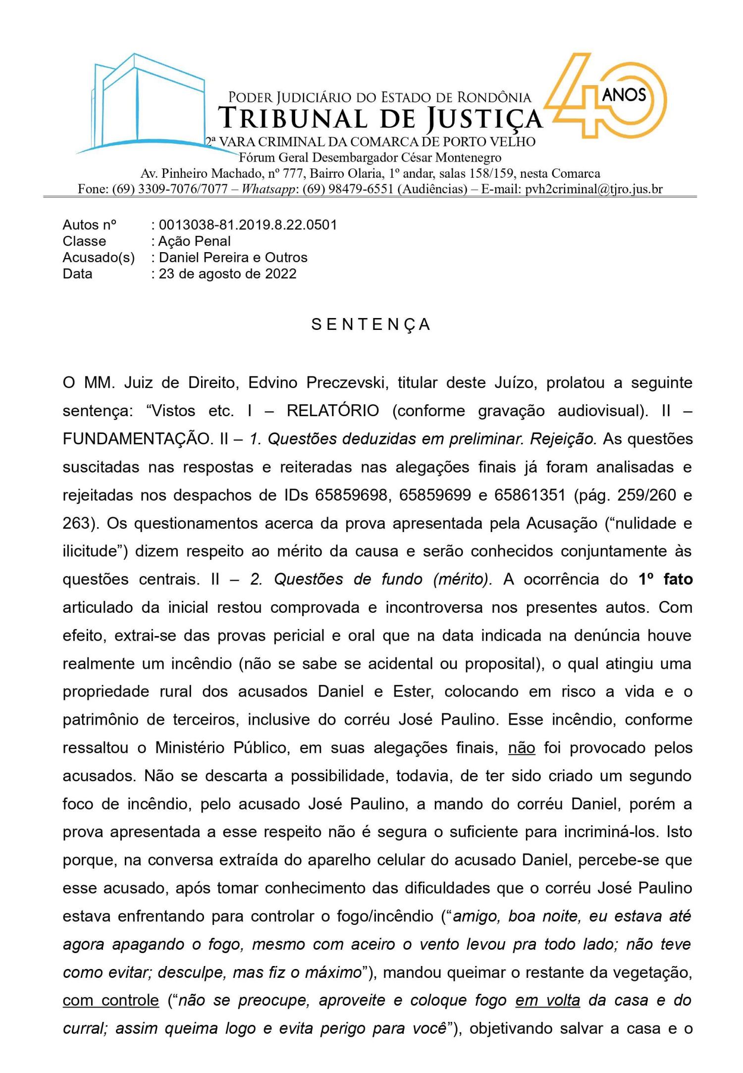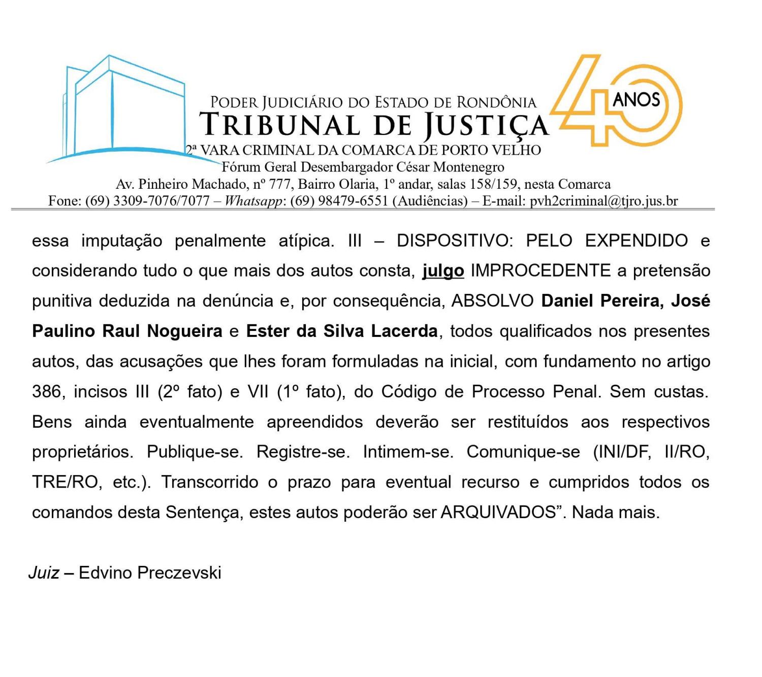 O caso causou transtornos e exigiu mobilização dos acusados em interpelações judiciais para provar o que sempre foi óbvio e no ultimo dia 23, terça feira passada, o juiz Edvino Preczevski, da 2ª Vara Criminal de Porto Velho, absolveu Daniel Pereira e os outros dois réus de todas as acusações, determinando o arquivamento do processo.